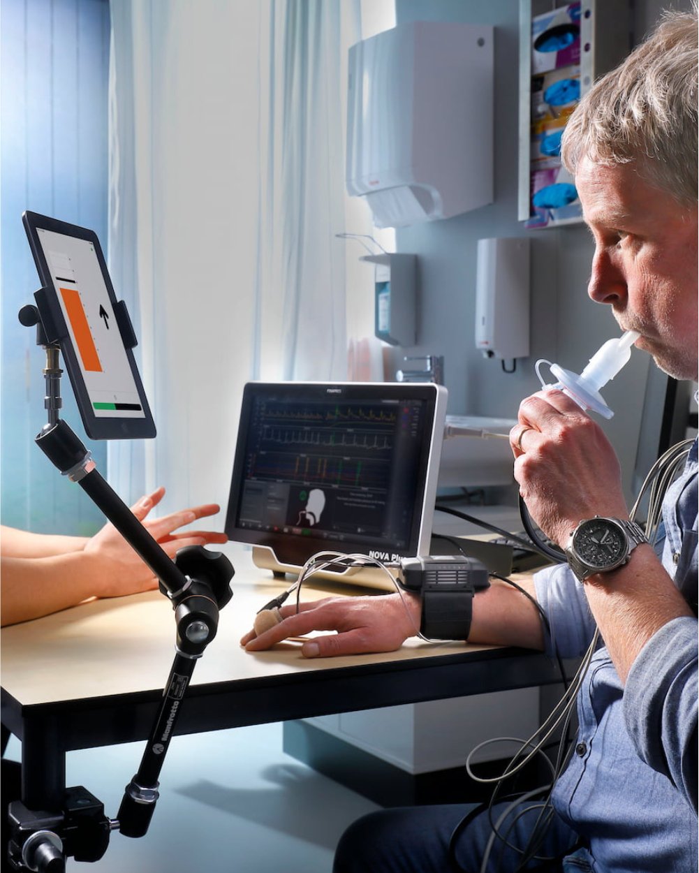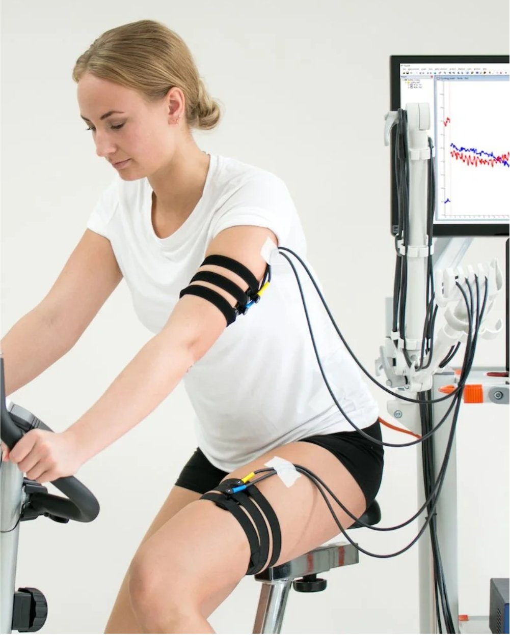 Equipamentos ópticos dedicados à análise da oxigenação e metabolismo muscular durante exercício controlado.